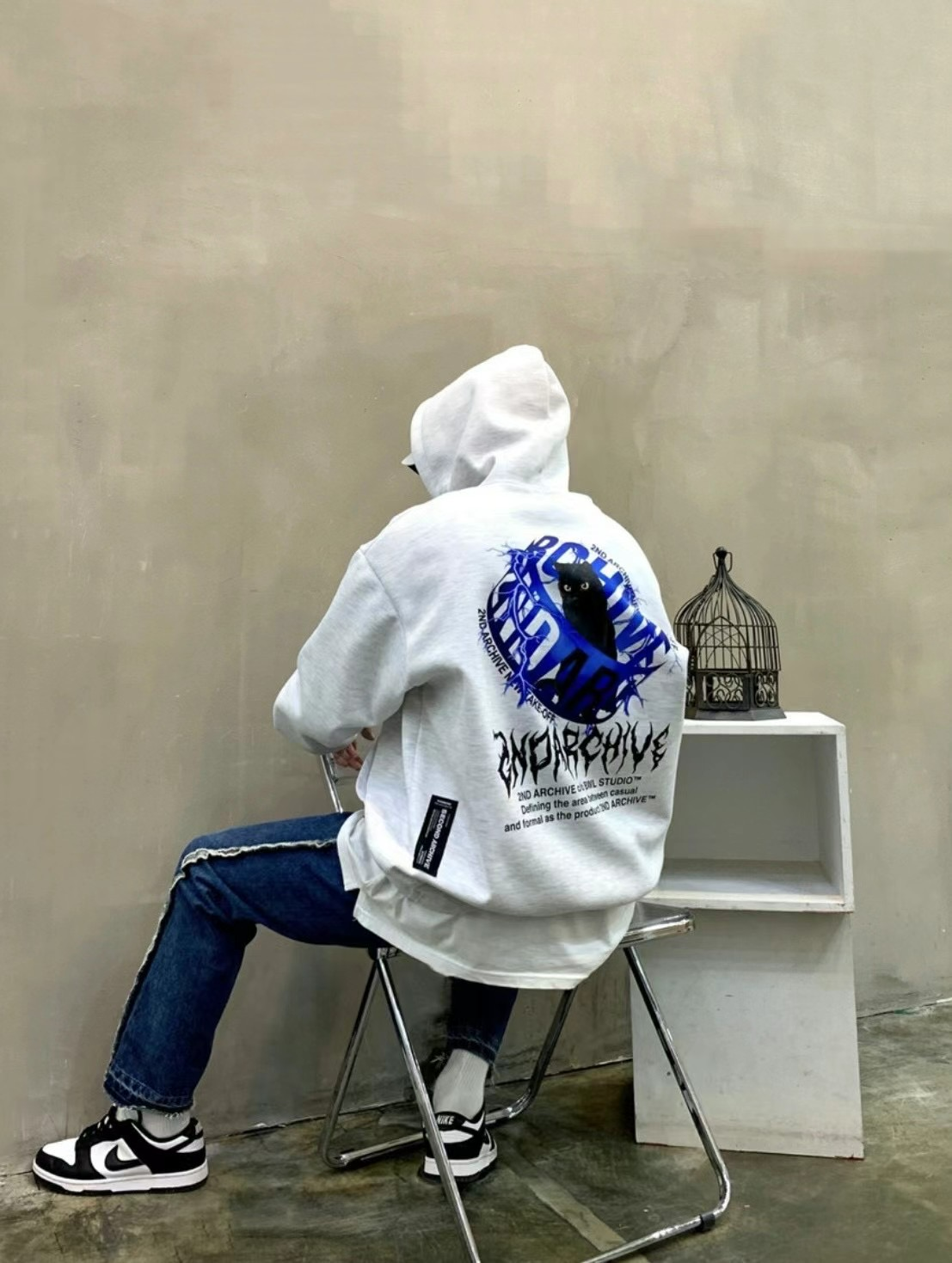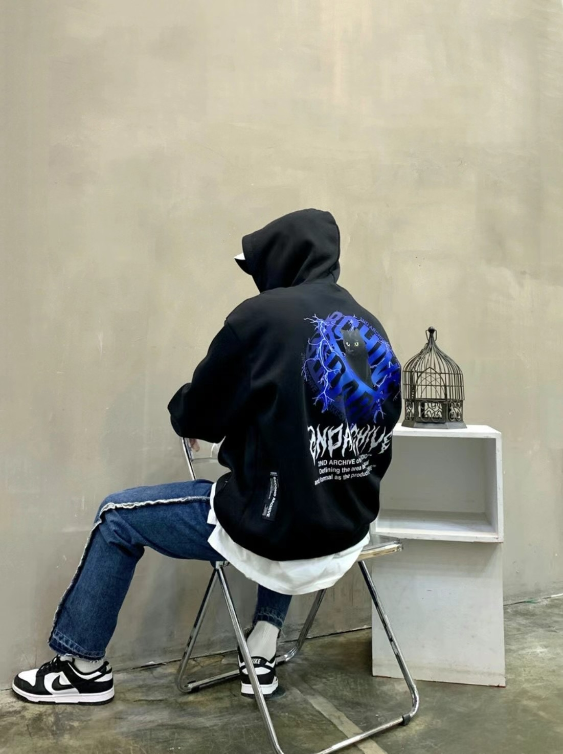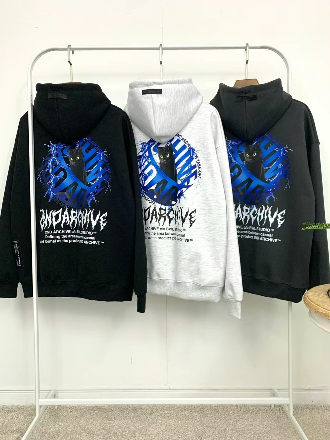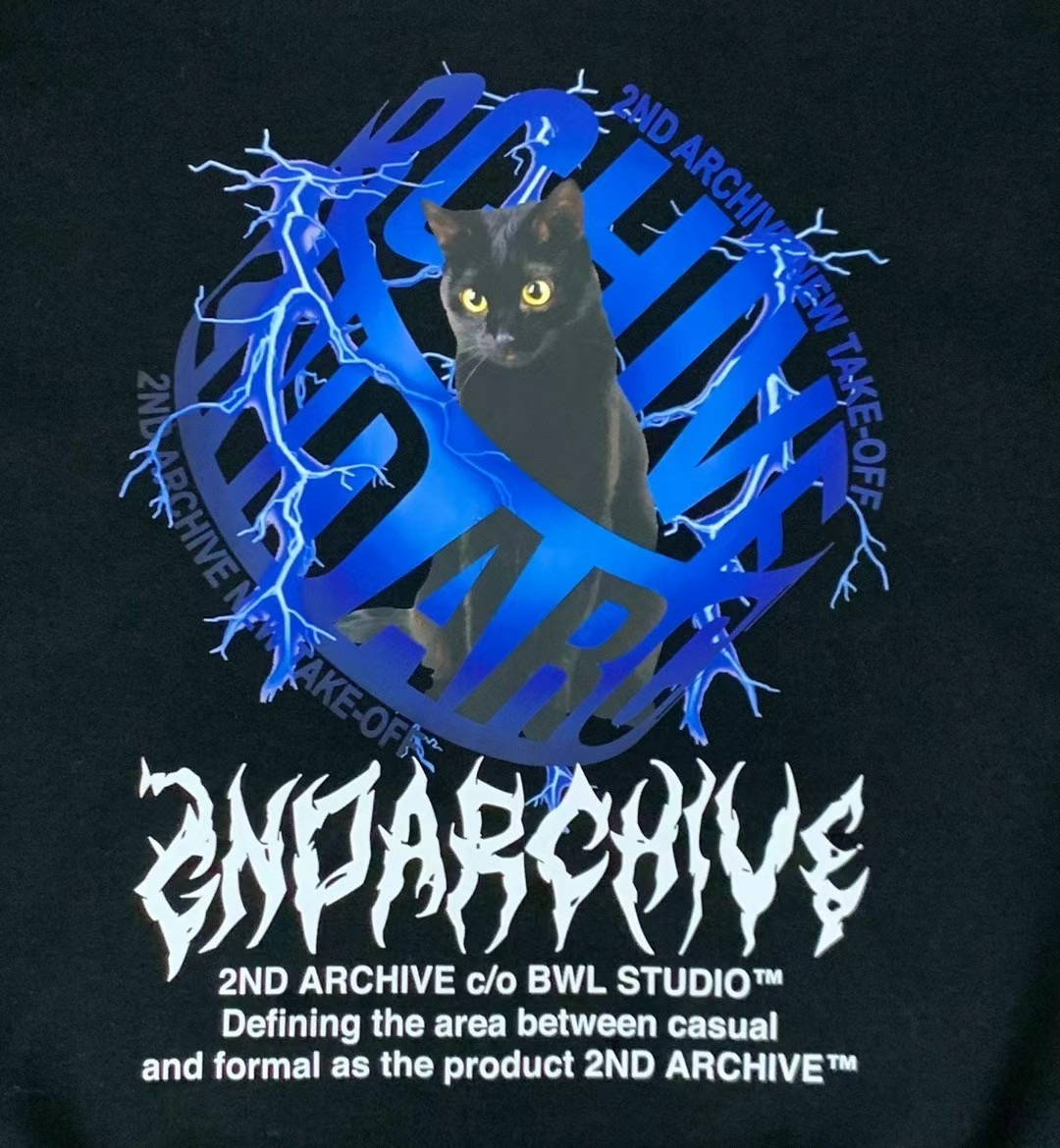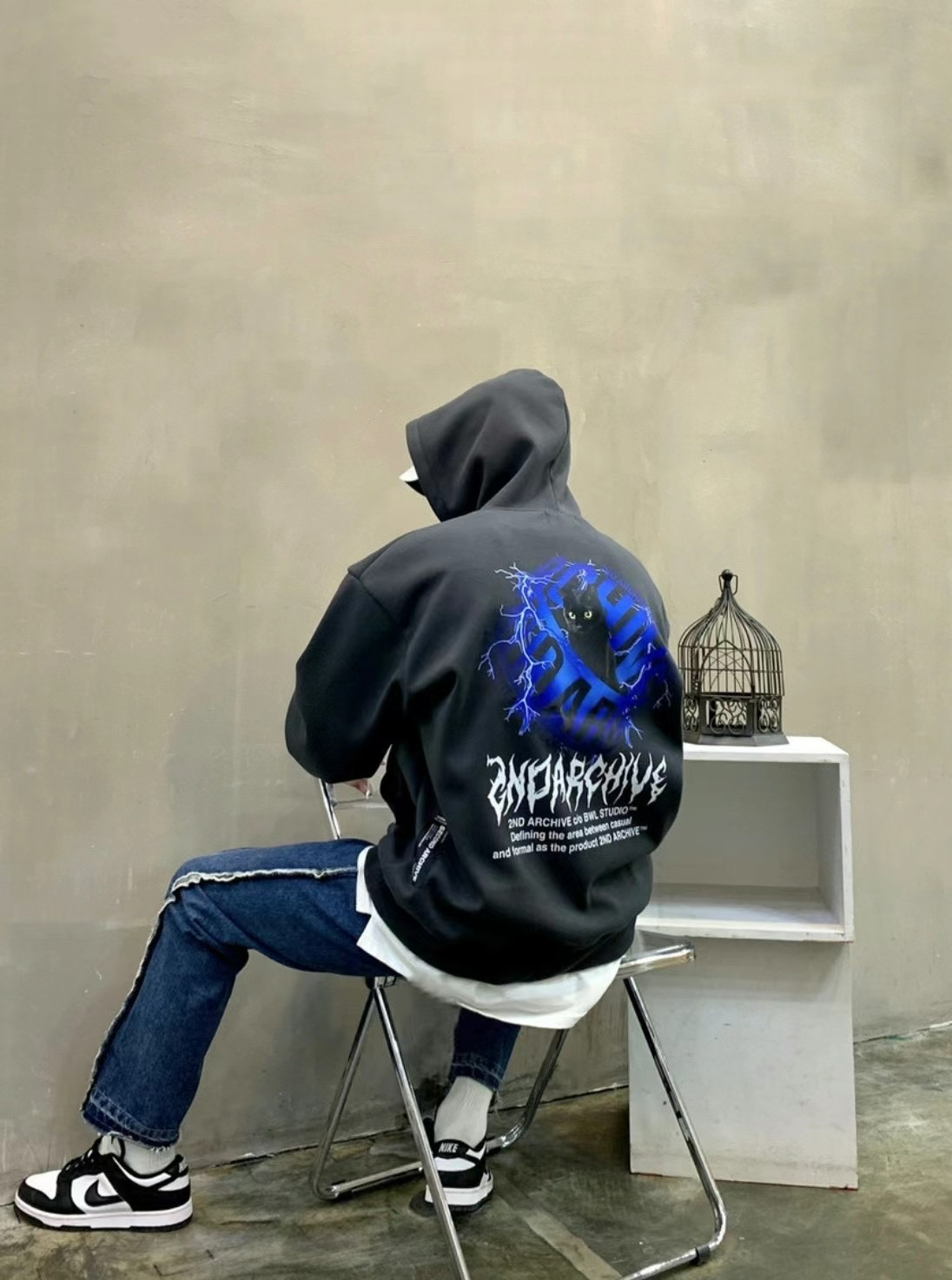 2ND ARCHIVE 正韓圓環閃電黑貓連帽帽T 黑/麻灰/墨 F