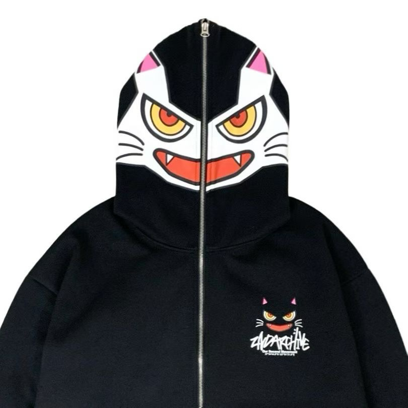 貓咪造型帽:拉鍊拉至頭頂即可形成完整的貓臉圖案,帽子上還有可愛貓耳印花,趣味十足。