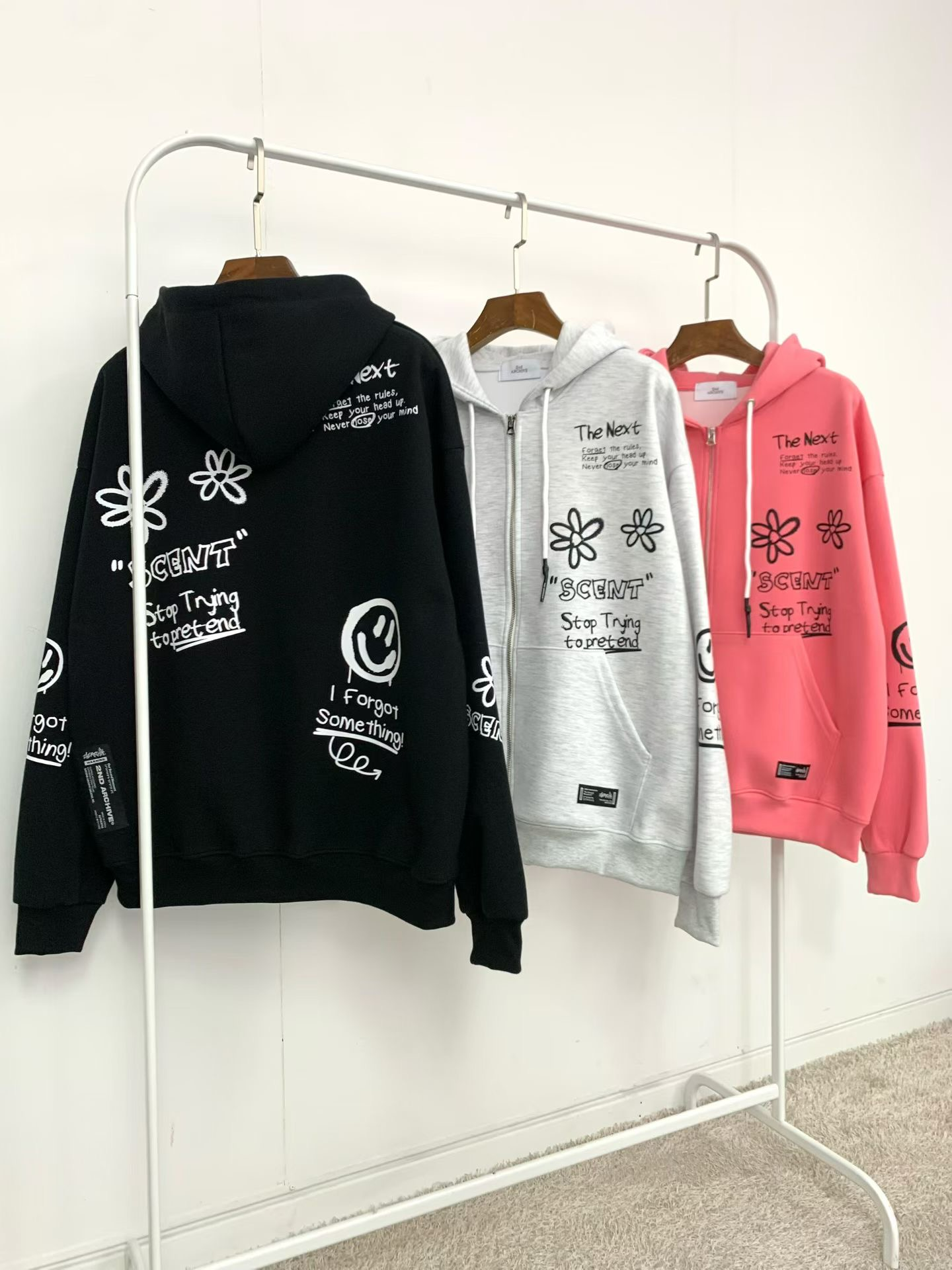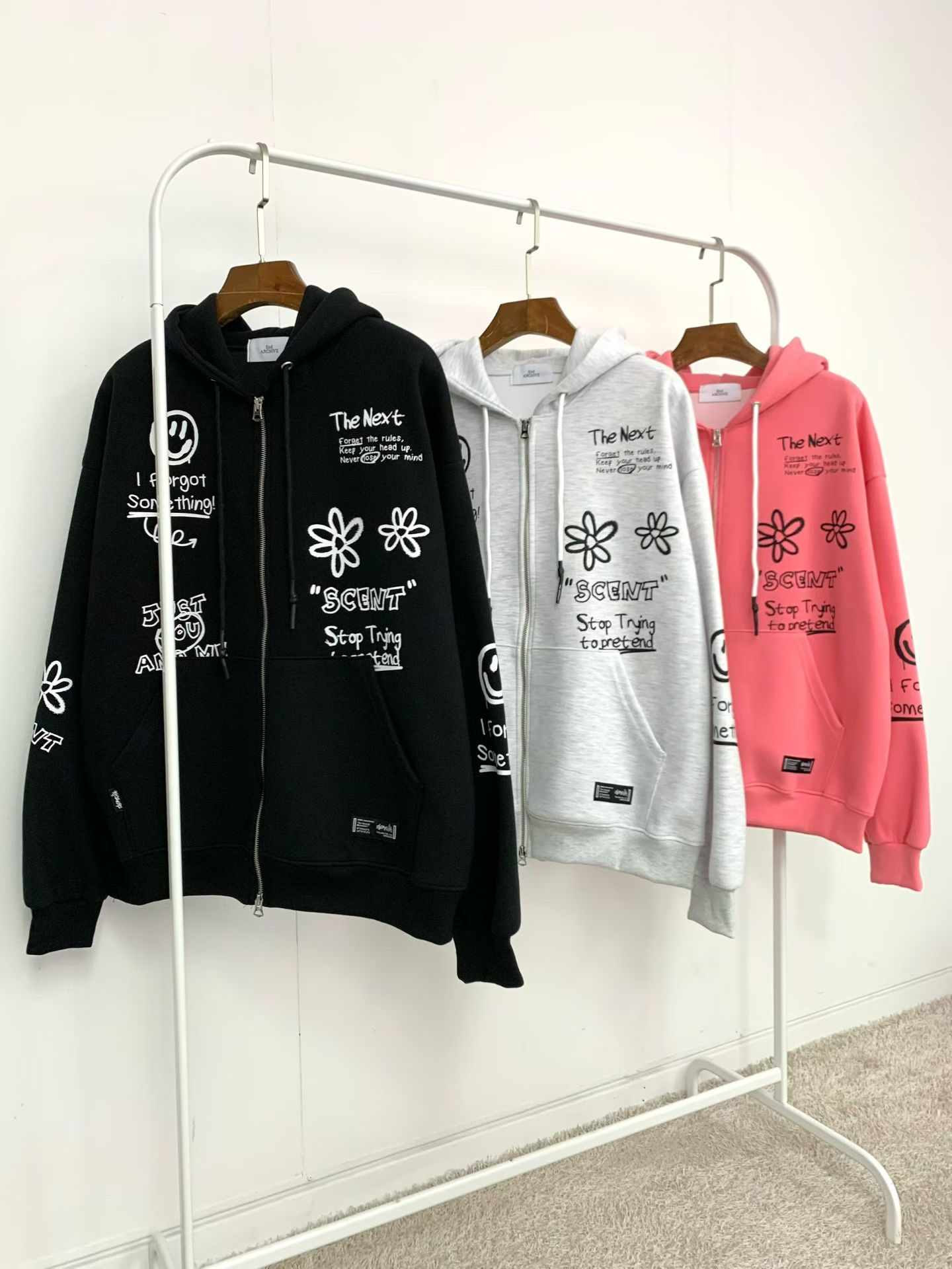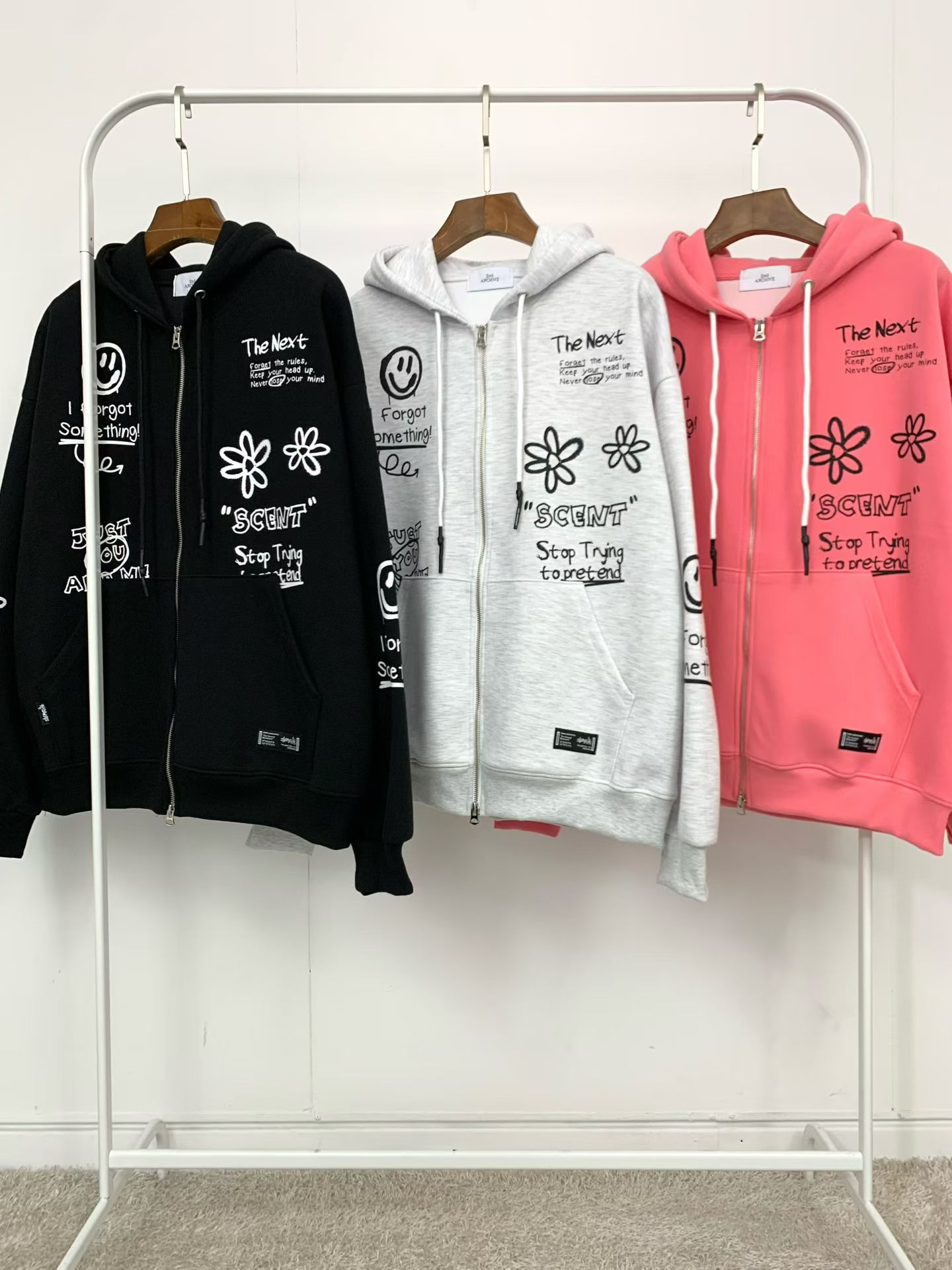 2ND ARCHIVE 正韓滿版塗鴉拉鍊帽T 個性笑臉花花圖案 韓風街頭 寬鬆連帽外套 男女同款外搭外套 秋冬帽T