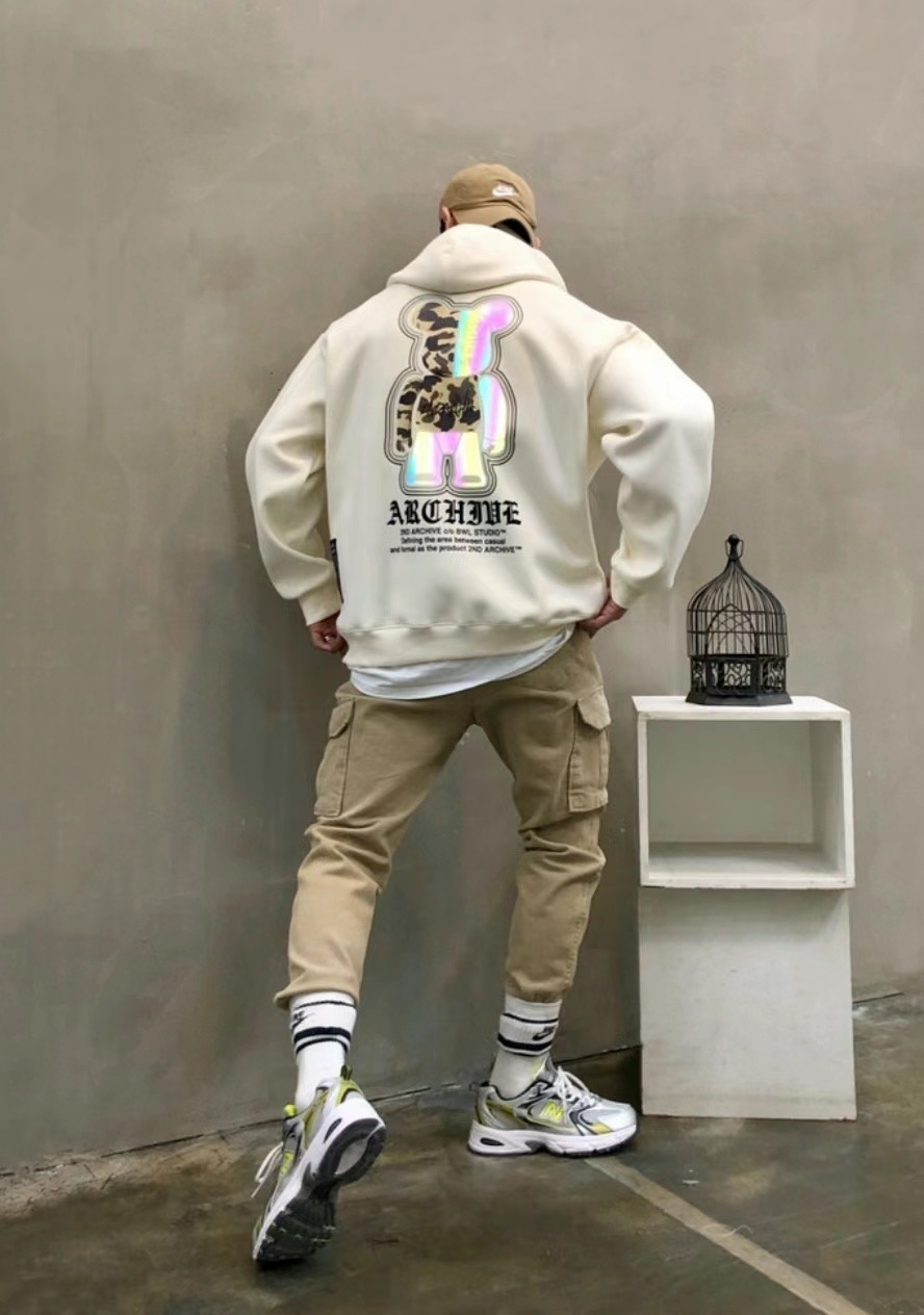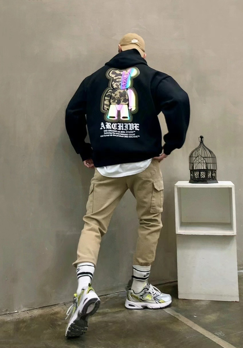 2ND ARCHIVE韓國潮牌 正韓反光迷彩熊寬鬆帽T 黑/奶油/軍綠