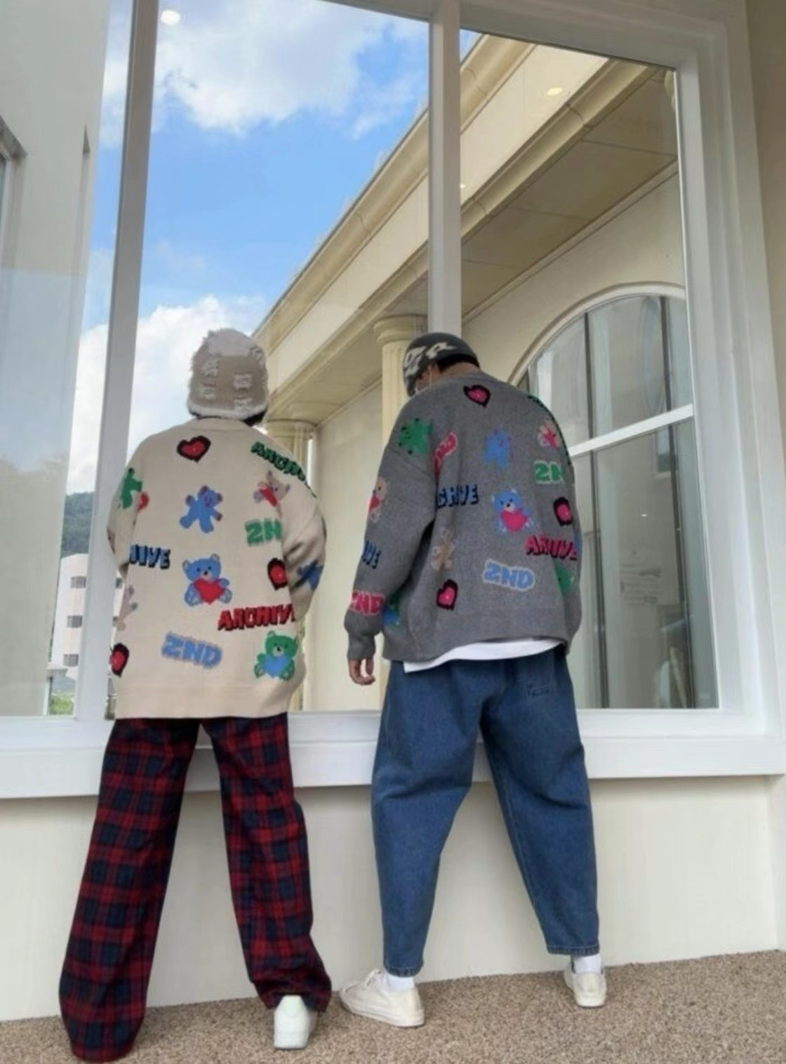2ND ARCHIVE韓國潮牌 高街滿版愛心小熊排釦針織外套 奶油/灰