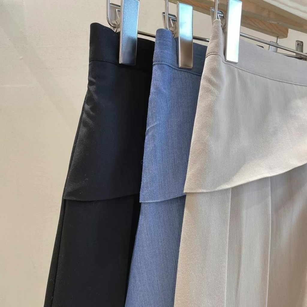 上衣落肩寬鬆設計,顯瘦又慵懶感十足,裙褲高腰剪裁修飾比例,百摺設計增加層次感,轉身也是亮點。